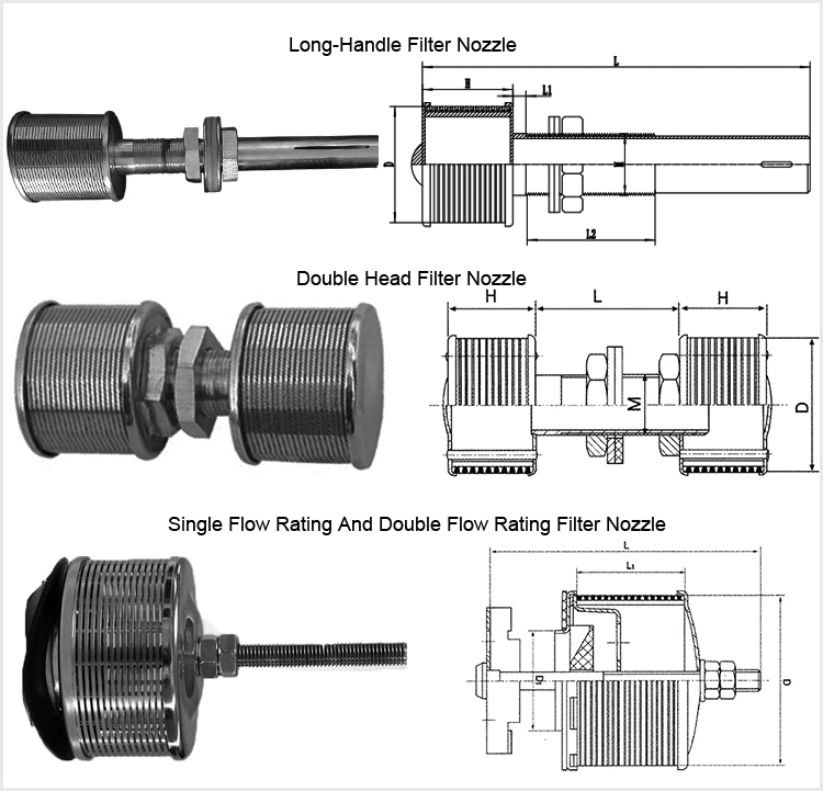 Le TNP fileté coincent des becs d'écran de fil peut être employé pour le liquide/solide ou le gaz/séparation solide, ou la conservation de médias (sable, catalyseur, résine). Les becs sont montés sur une plaque de maintien. Les dimensions et la distribution des becs de la plaque de maintien peuvent être changées pour obtenir une distribution d'écoulement optimisée.